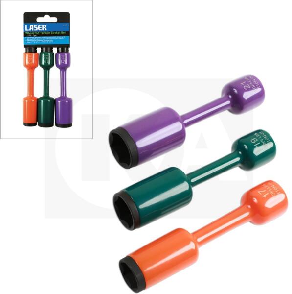 Laser Tools - UKTorziós, színkódolt, gépi dugókulcsok kerékcsavarokra - nyomatékhatárolóval (108 Nm). Légkulcsal kell használni és amikor a légkulcs elracsnizik, akkor kell egyből megállni és a dugófejek avékonyított ";torziós"; szárai segítségével 108 Nm körül húzzák meg a kerékcsavart (kerékanyát). Jellemzők:- méretezés: 17 / 19 / 21 mm (színjelőlt)- hosszúság: 120 mm (hatlapú)- csatlakozás: 1/2";- nyomatékhatár: 108 Nm- műanyag köpeny (alufelnire is)Figyelem: Mindig használjon nyomatékkulcsot a pontos nyomaték lellenőrzésére.